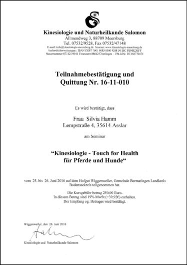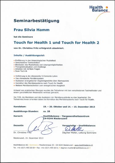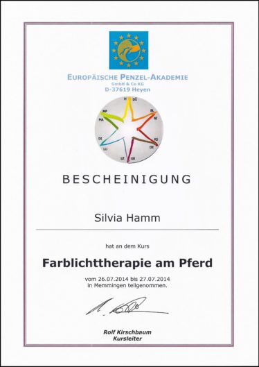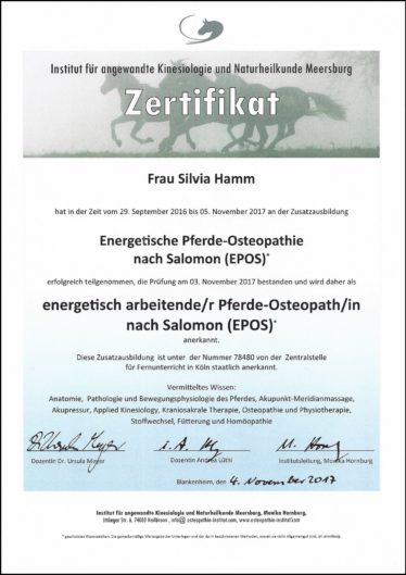 Um den Pferden nicht nur aus dem Sattel helfen zu können, machte ich zunächst eine Ausbildung zur energetischen Pferdeosteopathin nach Salomon (EPOS). Diese Ausbildung umfasst die Themen: