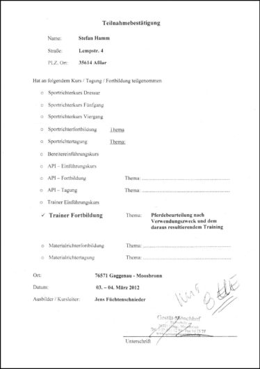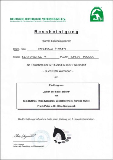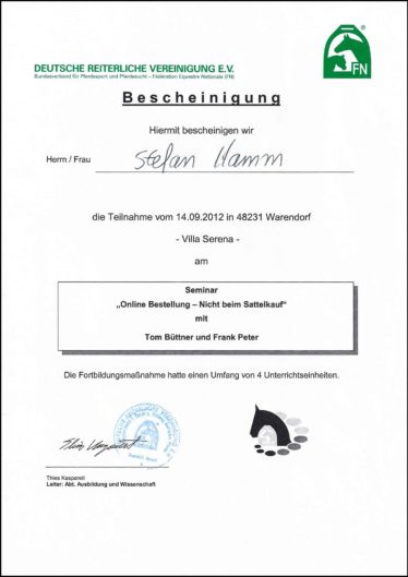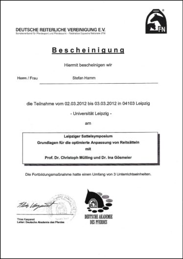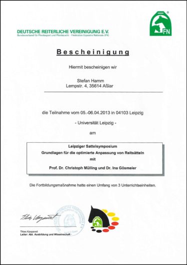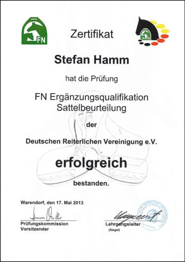 In der Ausbildung zum Reitsportsattler sind gemäß der Ausbildungsordnung die wichtigen Aspekte des Saddlefittings (u.a. Anatomie, Biomechanik und Bewegungslehre von Pferd und Reiter) nicht zwingend Ausbildungsbestandteil. Diese Wissenslücke schließt die Zusatzqualifikattion „FN-geprüfter Sattelbeurteiler“ und die Ausbildung zum „Qualified Saddlefitter“.